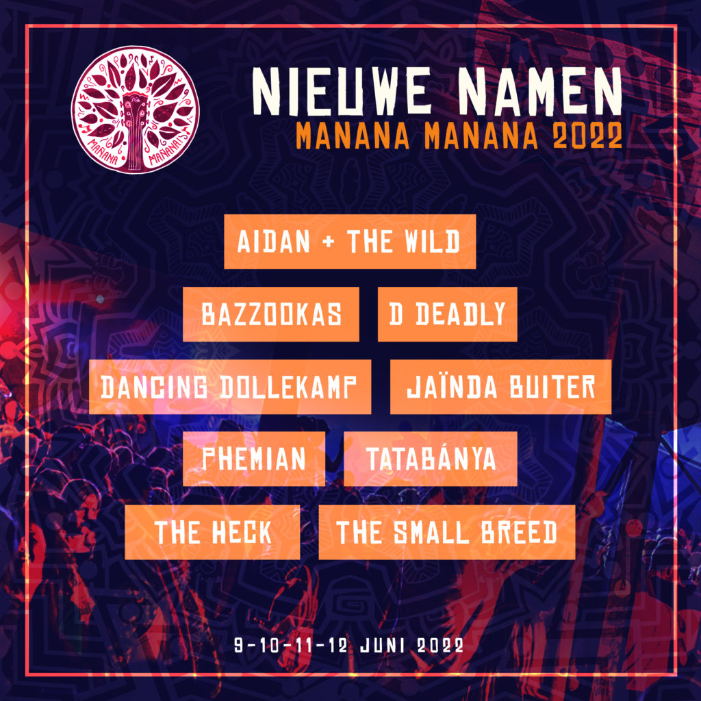 9 nieuwe namen voor Mañana Mañana 2022! En er zit weer van alles voor je tussen! Zo neemt de Eindhovense Aidan & The Wild singer-songwriter je mee op een muzikale reis met zijn interpretatie van folk en americana, kun je dansen zoals dat bedoeld is op de explosiviteit van de Bazzookas, uit je plaat gaan op gewoon goede gitaarmuziek van D Deadly & Dancing Dollekamp, genieten van de lage jazz- en hoge soul-noten van Jaïnda Buiter & Phemian, genieten van de bijpassende klanken van Tatabánya tijdens de yogasessies en rock ’n roll meemaken zoals dat in de 60’s bedoeld was met The Heck & The Small Breed: dit is een tipje van de sluier van Mañana Mañana 2022!