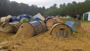 Het vraagteken en het woord ‘toch’ in deze zin verraden echter enige twijfel in de anders zo standvastige Gijs. En terecht…. Eén week voorafgaand aan de opbouw van ons festival worden we al redelijk geteisterd door hevige regenval. Regen en wind, twee van de grootste vijanden van een semi-openlucht festival. Los van het feit dat regen erg vervelend is voor de crew en bezoekers, kan wind tijdens showdagen veranderen van een fijn briesje naar een allesvernietigend natuurgeweld dat je niet wilt op een terrein met veel bezoekers.