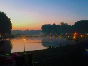 Na een uurtje of vijf gemarteld te hebben in het licht van de schijnwerpers op de cabine, is het echt een genot als het weer licht begint te worden. Met onze vierkant-geworden-ogen zien we de mist over de vijver in Hummelo trekken en zijn stiekem bijna emotioneel dat we dit werk mogen doen…