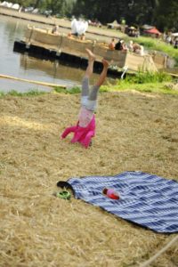Vanuit mijn vorige baan heb ik nog veel contacten in de agrarische sector, waardoor het vinden van een wagen vol stro, zelfs midden in de nacht geen probleem vormt. Jan Jaap neemt plaats op een shovel om de toegangsweg, tot aan waar ooit het gras van het festivalterrein begon, te ontdoen van een centimeter of 30 aan modder. Ondergetekende kruipt in de beslagen cabine van een mobiele kraan om banen stro over het gehele festivalterrein te leggen. Een hakselaar zal morgenochtend om 08.00 uur komen om het grove stro te versnipperen en een mooi deklaagje aan te leggen. Onze collega’s en bezoekers zullen niet weten wat ze morgenochtend bij aankomst zien. We hebben met 2 man in een paar uur tijd van een onbegaanbare modderbak weer een festivalterrein gemaakt! Jan Jaap en ik zijn nu al zo trots al een pauw! En verdomd, het stopt ook bijna even met regenen…..