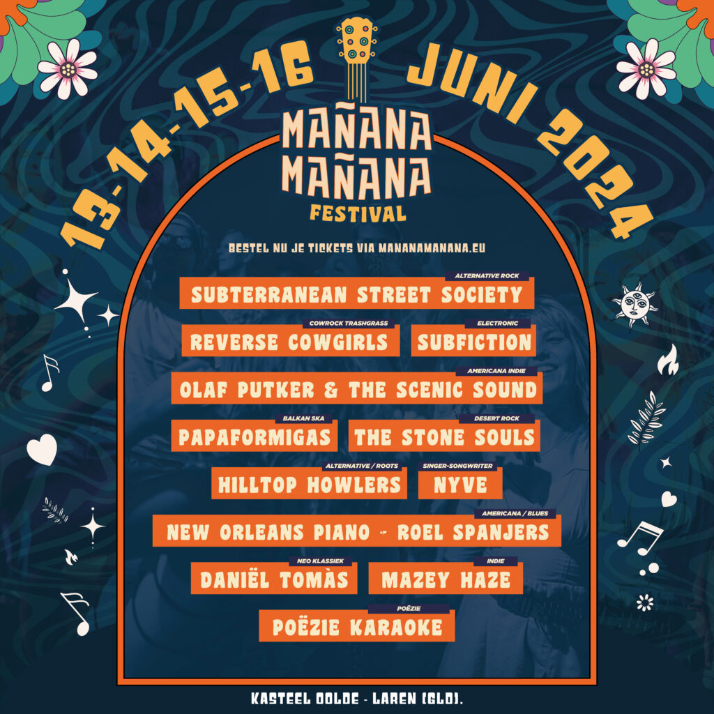 Subterranean Street Society | Olaf Putker & the Scenic Sound | Reverse Cowgirls | Subfiction | The Stone Souls | Papaformigas | Hilltop Howlers | NYVE | New Orleans piano – Roel Spanjers | Daniël Tomás | Mazey Haze | Poëzie Karaoke
