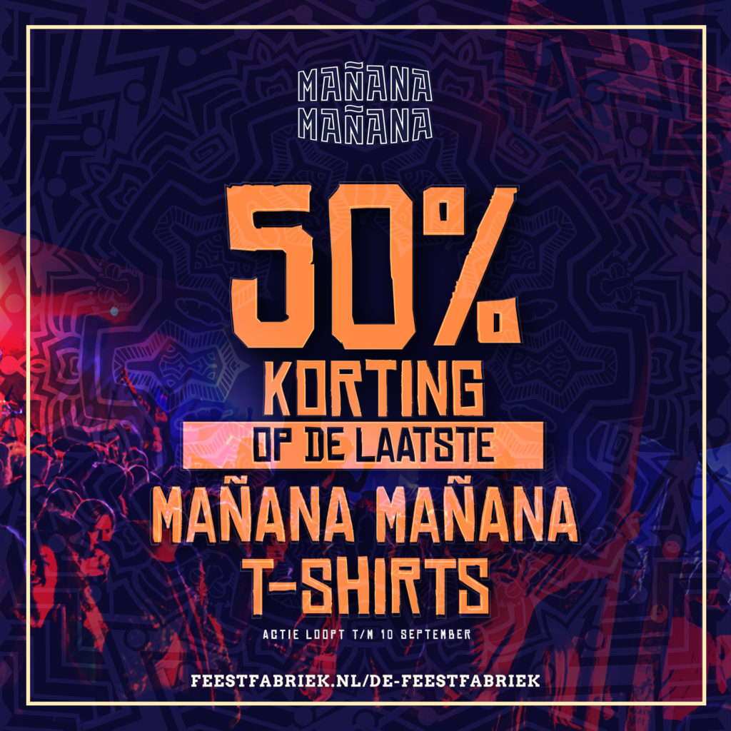 En om deze service-uitbreiding te vieren, hebben we een leuke actie bedacht! Vanaf vandaag t/m 10 september krijg je 50% korting op alle T-shirts in onze webshop. En als je die dus ook nog eens voor 15.30 uur besteld, versturen wij ‘m vandaag nog. Weet je zeker dat je er tijdens Mañana Mañana 2022 geheel in stijl bij kunt lopen!